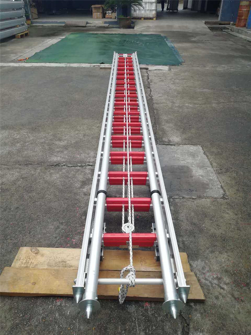 選用高強(qiáng)鋁合金材料制成。主要用于中小城市無舉高車、普通梯又達(dá)不到高度的場所。是消防隊(duì)員登高救人,撲滅火災(zāi)時(shí)必備工具。也適用于工廠、機(jī)關(guān)、部隊(duì)、商店、電工、安裝工、市政建設(shè)人員登高作業(yè),其用途廣泛。該梯由上、中、下三節(jié)組成,下節(jié)梯安裝有支撐桿,用于增加穩(wěn)定性,下節(jié)梯和中節(jié)梯的側(cè)板上裝有滑槽,中節(jié)梯和上節(jié)梯的側(cè)板下端裝有導(dǎo)板,可有效保證中節(jié)梯沿下節(jié)梯滑動(dòng)、上節(jié)梯沿中節(jié)梯滑動(dòng),上節(jié)梯上端裝有輪子,可方便拉梯的展開和縮合,拉梯的升降裝置由滑輪、拉繩和撐腳組成,在展開和縮合過程中,可保證限位安全可靠。